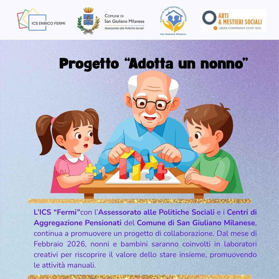 Fino a maggio riprende il progetto intergenerazionale “Adotta un Nonno” con i bambini dell’istituto E. Fermi (scuola primaria Giovanni XXIII, W. Tobagi e L. Da Vinci) al quale partecipano i “nonni” del laboratorio creativo del centro Piazza della Vittoria e di Sesto Ulteriano e del laboratorio di cucito e di pittura del centro di Piazza della Vittoria.