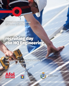 Il Comune di San Giuliano Milanese e AFOL Metropolitana organizzano un recruiting day con HQ Engineering Italia. La società, attiva nel settore delle telecomunicazioni e delle energie rinnovabili ricerca installatori ponti radio, progettisti CAD, progettisti elettrici e operai generici junior.