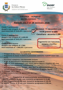 Il Comune, in collaborazione con l’Associazione AUSER Volontariato ONLUS di San Giuliano Milanese, organizza anche per la stagione invernale del 2026, i soggiorni climatici per anziani residenti e autosufficienti nella splendida località di Alassio (SV).