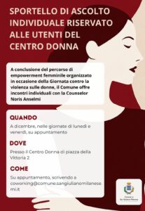 A conclusione del percorso di empowerment femminile organizzato in occasione della Giornata contro la violenza sulle donne, il Comune offre incontri di ascolto individuale con la counselor Noris Anselmi.