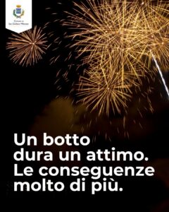 Un capodanno sereno e sicuro è una responsabilità condivisa. L’utilizzo di materiali esplodenti, spesso sottovalutato, comporta rischi concreti per l’incolumità delle persone, in particolare bambini e anziani, per gli animali domestici e selvatici, oltre a possibili danni a edifici, veicoli e arredi urbani. Ogni anno tali comportamenti comportano numerosi interventi di emergenza che impegnano Vigili del Fuoco, forze di sicurezza e servizi di soccorso, riducendo la loro capacità operativa in situazioni realmente critiche e gravi. L’Amministrazione, per evitare questo scenario per l’imminente fine dell’anno, ha deciso di promuovere una campagna di sensibilizzazione per invitare la cittadinanza a scegliere forme alternative, sicure e rispettose, che consentano di accogliere il nuovo anno senza creare pericoli o disagi per la comunità.