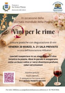 L’evento, organizzato in collaborazione con l’Associazione “Allibratori”, si terrà venerdì 20 marzo, alle 21, in Biblioteca e unirà letture poetiche alla degustazione di vino, in un percorso originale che accosta la poesia al gusto e alla convivialità.